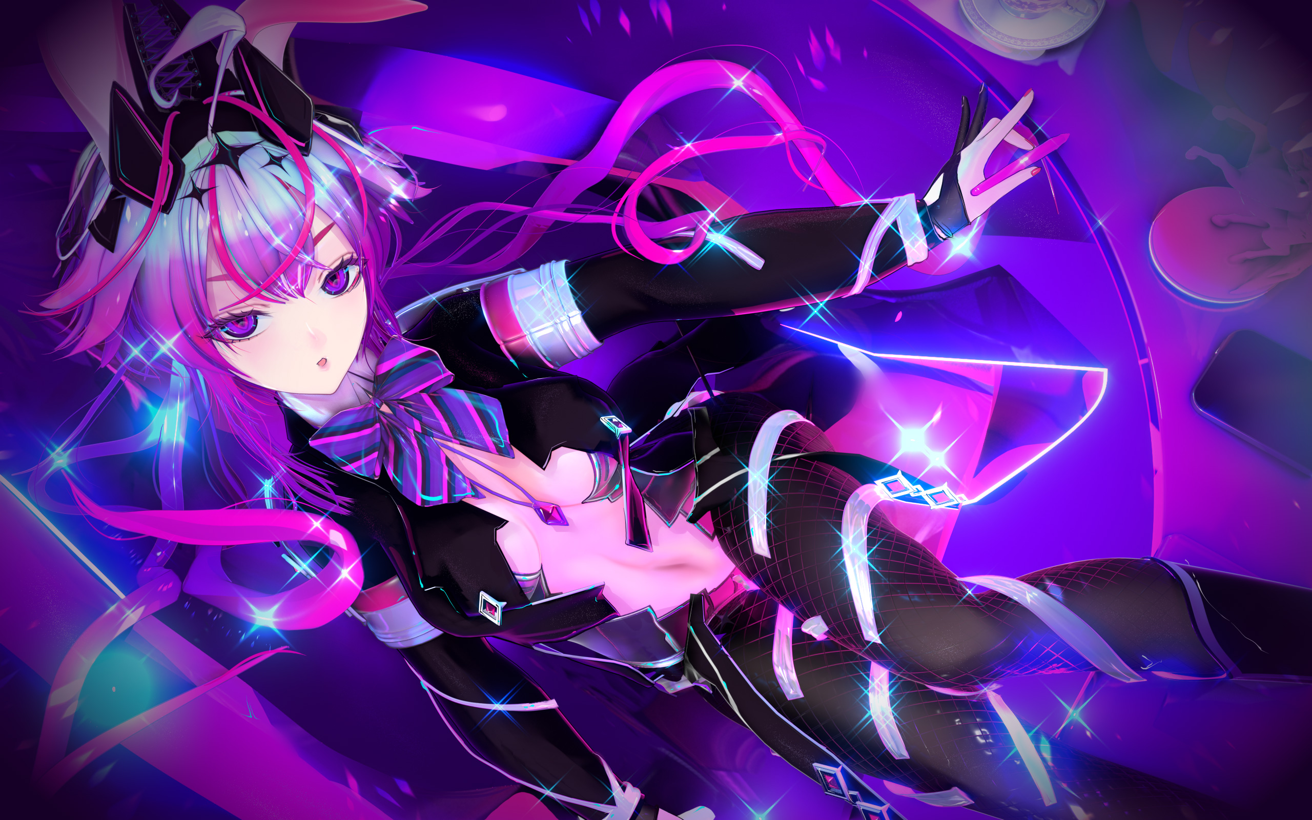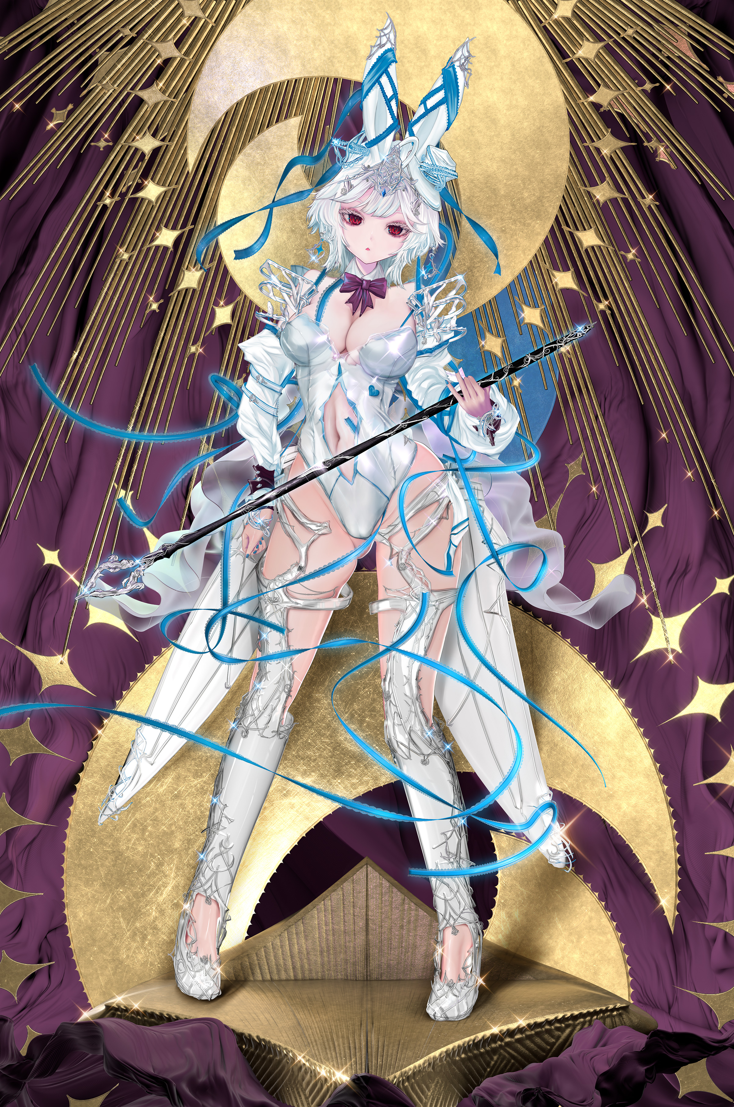 うさぎさんだね。今回はイコンっぽいレイアウトの好みが出たかも。キャラデザのラフを描いた後に、イメージに近い方法を取れる3Dと手描きの比率を考えたんだけど、どちらかというと手描き寄りで仕上げたよ。メタリック装飾みたいな手間がかかるものは3Dだとポリゴン数の壁にぶつかったり、手描きだと光学的性質が考慮しきれないとか難しいジレンマに陥るね。デフォルメと情報量のバランスも色々な方向がありそうだな。